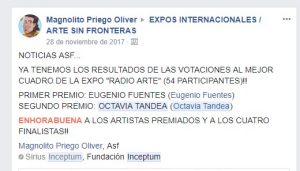 Con motivo de la inauguración de la nueva emisora de radio de la FUNDACIÓN INCEPTUM (C/Rector Triado, 31, Bajos, Barcelona) se organizo la EXPOSICIÓN COLECTIVA «RADIO ARTE» CON CERTAMEN DE PINTURA entre 7 de Septiembre y 7 de Octubre del 2017.